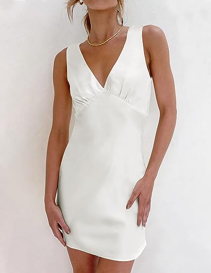 • You need to add this sexy short dress to your wardrobe. In a smoothly satin material with a deep v neck design, sleeveless, solid color, backless, ruched detailing at the bust and a figure-flattering mini length.